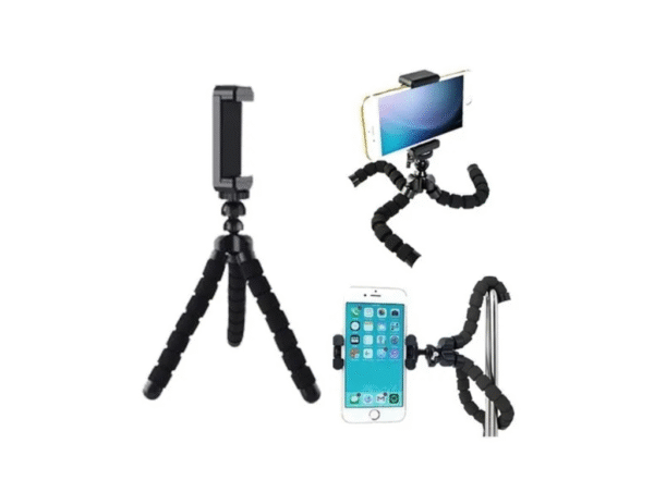 -Mini trípode flexible y articulado para celulares con adaptador universal incluido capaz de girar 360°.